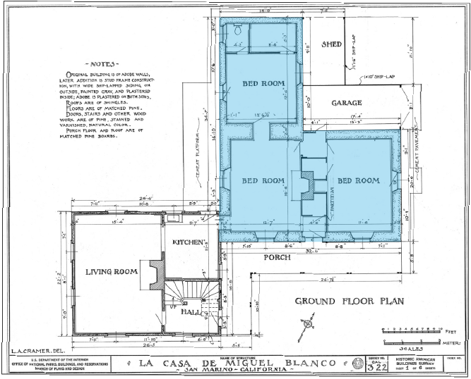 The Michael White Adobe floor plan, as drawn in 1935 for the Historic American Building Survey (HABS). The shaded area shows the plan of the existing adobe building. The two-story wood-framed addition (lower left) built in 1870 was relocated to San Gabriel around 1947. Library of Congress.